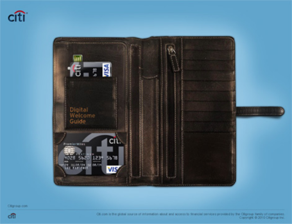 Calcutta based leather goods manufacture to customise a leather pouch that can accommodate USB, credit card and welcome message. This leather pouch was embossed with citi logo for brand recall whenever customer travels. Also to