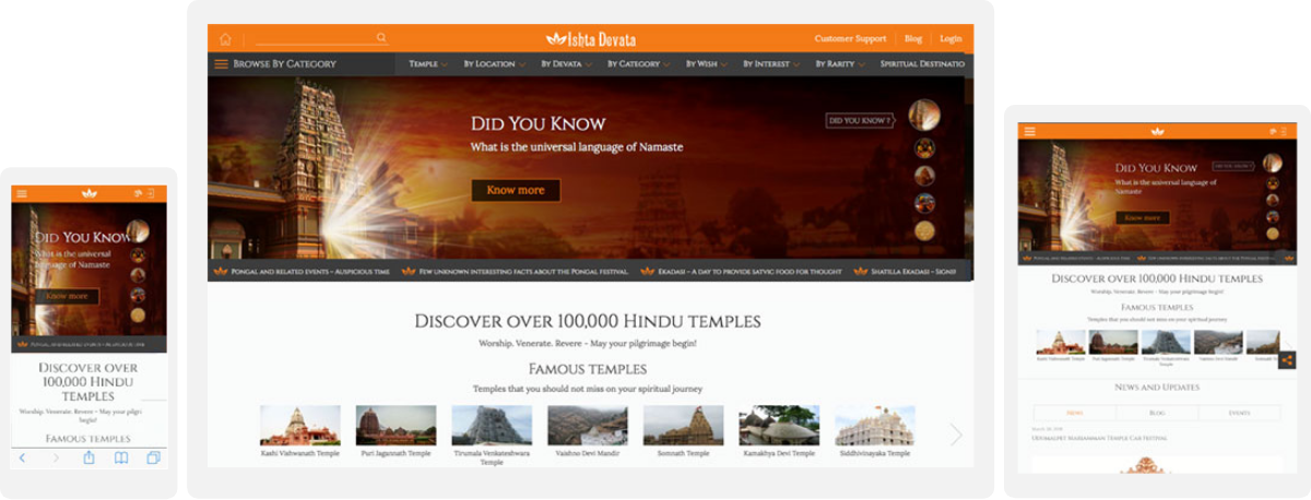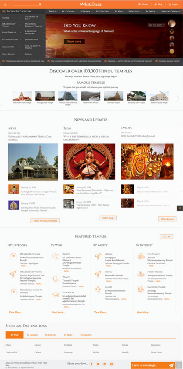 Ishtadevata.com was launched on the 29th of January 2015. Ishtadevata.com currently hosts information and content on over 100,000 Hindu temples across the globe and is a burgeoning community that is growing and touching lives every day. Its unique proposition and one of a kind experience truly make it the World’s Largest Hindu Temple Portal. http://www.ishtadevata.com