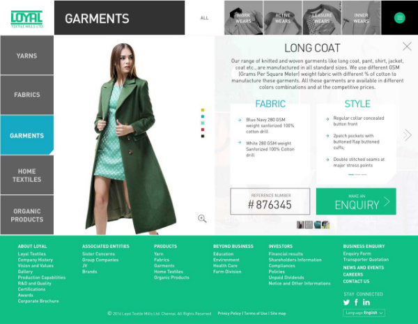 We succeeded in creating a highly responsive website from the ground up – in a matter of 60 days. Through the enquiry portal, we created an online property for a completely offline business for generating sales. Loyal Textiles’ website traffic and search engine rankings increased dramatically. Being a B2B company, Loyal Textiles was greatly benefited from the leads generated as well as increases the conversion rate of the website through the enquiry page. http://www.loyaltextiles.com/
